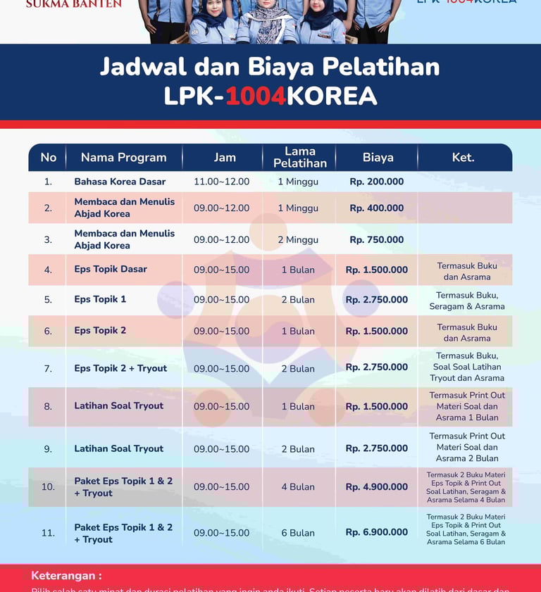 Biaya pendidikan 4 bulan cuma 5jt, termasuk 2 buku materi, seragam, dan asrama.